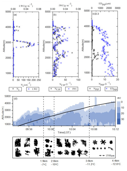 The echo intensity of 4.4 to 3.6 km is less than 10 dBZ, and the height of the cloud top is 4.2 km. In the vicinity of the cloud top (4150 m, −12.6 °C), there are round, plate-shaped ice and snow crystals. With decreasing height (4150 to 3850 m, −12.6 to −11.7 °C), a large number of star-shaped and plate-shaped ice and snow crystals are formed. With the height decreasing further (3850 to 3600 m, −11.7 to −11.2 °C), the star-shaped and plate-shaped ice and snow crystals grow further, with some growing into dendritic ice and snow crystals and needle ice and snow crystals appearing at the same time. With increasing deposition, the maximum particle number concentrations obtained by the CIP and PIP are 49 L−1 and 1.2 L−1 at 400 m below the cloud top. The particle diameter is less than 2000 μm, and the maximum ice water content is 0.052 g·m−3, which is low.