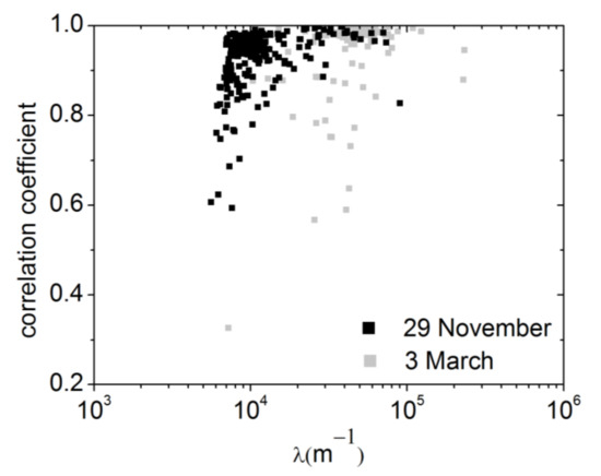 To further study the fitting accuracy of the M-P distribution to the ice and snow crystal spectra, the distribution of the fitting correlation coefficient with λ in the two snowfall processes is shown in Figure 9. λ is the linear correlation coefficient between the fitting data and the original data. The larger λ is, the higher the fitting accuracy is. The correlation coefficients λ are mainly between 0.8 and 1.0, and there are some scattered low values, which indicates that the fitting accuracy of the M-P exponential distribution is high.
