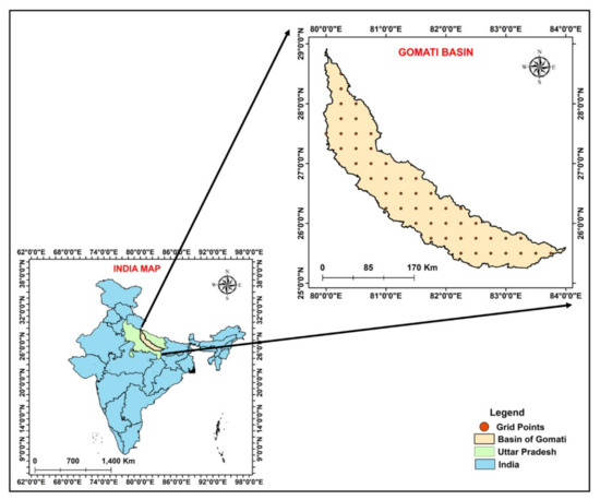 The Gomati river basin is bounded between longitude 80°0′10″ E-83°11′4″ E and latitude 25°31′16″ N-28°53′17″ N in the Doab region of the Ganga and Ghaghara river basin covering a total area of 30,437 km2 [21]. It is one of the main tributaries of River Ganga originating from Fulhaar Jheel lake near Mainkot of about 30 km east of the Pilibhit town of the Uttar Pradesh (see Figure 1). The river basin is mainly comprised of the alluvial stratum. The river is the primary source of supply for the cities of Lucknow and Jaunpur in Uttar Pradesh. The entire basin’s climate varies from semi-arid to sub-humid tropical with an average annual precipitation of 850–1100 mm. The basin receives about 75% of the total annual precipitation between June and September due to the southwest monsoon. The basin has a gentle southeasterly slope of maximum and minimum elevations varying between 58 m and 238 m [22].