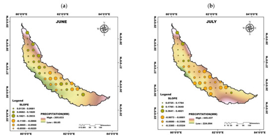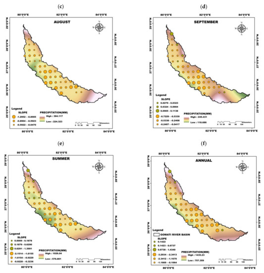 The spatio-temporal trend analysis of precipitation for the entire period is carried out at monthly, seasonal and annual time scale (Figure 2). The additional supporting analysis is shown in the Supplementary Materials for brevity purposes (Figures S1–S9). It is evident that there has been a significant reduction in the precipitation amount over the basin, especially during the months of June-September (Figure 2). Mixed positive and negative trends are observed in June with negative trends concentrated toward the basin’s southern region. Slightly positive and significant negative trends are seen in July towards the basin’s northern and southern regions with maximum slopes at 0.4821 and −0.9073. August showed negative trends at all the stations over the basin with southern region exhibiting significant negative trends with a maximum slope of −1.2952. Significant negative trends with a maximum slope of −0.7229 are observed at almost all the stations over the basin except for a few stations in the northern region for September. Seasonal precipitation also showed negative trends with the summer season being statistically significant with a maximum slope of −2.1514. A similar pattern of significant negative trends at all stations is observed for annual precipitation in the basin’s central and southern regions with a maximum slope of −3.2934. It can be inferred from the monthly, seasonal and annual precipitation trends that there has been a significant reduction in precipitation during the period (1951–2018), especially in the basin’s central and southern region. The decreasing in precipitation agree with the previous studies concerning precipitation trends across India at various spatial (regional, sub-basin, basin and meteorological sub-divisions, homogeneous regions) and temporal scales (monthly, seasonal, and annual) [48,49].