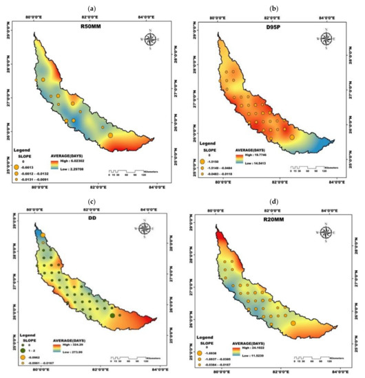 In this context, observation, detection, and detailed analysis of extreme climate events have become imperative. The detection of extreme climate changes requires the use of specific indices [16]. Different extreme indices have evolved and are now focused on relative thresholds related to the tails of distributions of meteorological variables [17]. Out of the several indices, the Expert Team on Climate Change Detection and Indices (ETCCDI) have selected around 27 indices as prominent ones [5].