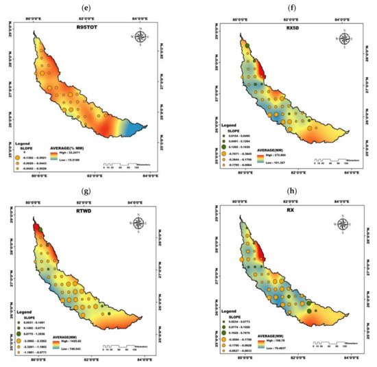 Grid locations having significant trends in the selected extreme climate indices expressed along with the trend line’s slope for (a) R50MM, (b) D95P, (c) DD, (d) R20MM, (e) R95TOT, (f) RX5D, (g) RTWD, and (h) RX.