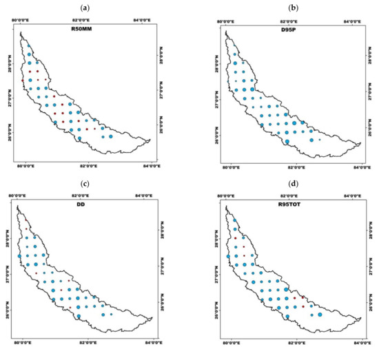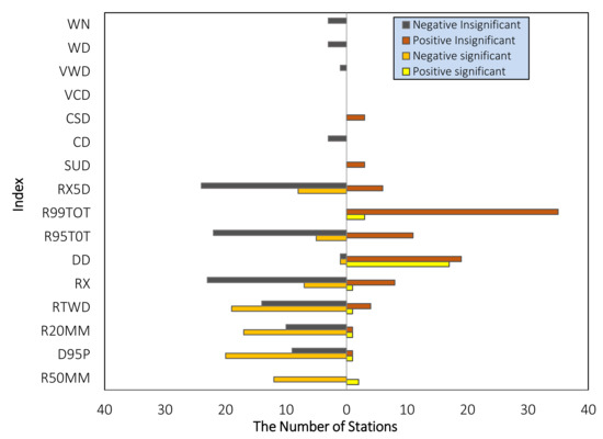 The spatio-temporal trends in 16 selected extreme climate indices for the entire period is presented in Figure 3. Figure 4 provides a summary of the number of stations showing significant trends of extreme climate indices. The results show a substantial reduction in the precipitation amount over the entire basin, barring few exceptions. This significant negative trend is visible in RTWD, highlighting a considerable decrease during the period with a maximum slope of −3.3002 at the basin’s central region. Although the trends of all the stations are decreasing, 19 stations were statistically significant. R50MM for all stations showed decreasing trends, 12 of which were statistically significant, with higher trend slopes of −0.6613 in the basin’s southern region. D95P showed negative trends for all stations over the basin, out of which 20 were significant and the maximum slope was found to be equal to −1.5150 in the southern region. Further, 17 stations displayed statistically significant negative trends for the index R20MM with maximum slope (−1.6938) being observed at the southern region. A similar pattern of negative trends can be observed with the other precipitation indices such as R95TOT, RX5D, and RX for almost all the stations. The number of dry days (DD) showed positive trends during the period over the basin at 36 stations out of which 17 stations are statistically significant with a maximum slope of 2 at the southern region of the basin. It is evident from the negative trends of various precipitation indices that there is a significant reduction of precipitation over the basin. The index DD exhibiting positive trends over the basin during the same period indicates that the basin has moved towards drier weather.