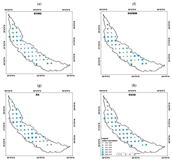 Spatial distribution map of extreme climate indices (a) R50MM, (b) D95P, (c) DD, (d) R95TOT, (e) RTWD, (f) R20MM, (g) RX, and (h) RX5D in Gomati Basin based on the Hurst Exponent.