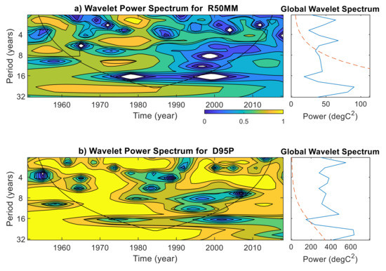 Overall, the wavelet spectra of most of the extreme climate indices showed variability within the 4–8 years and for some, the inter-decadal variability is prominent. Earlier study by Rathinasamy et al. [50] have shown there is a linkage between extreme precipitation in the Indian subcontinent and the global climate teleconnections such as ENSO and PDO. Following that study, the reason for the presence of dominant variability observed in the extreme climate indices could be linked to global teleconnection patterns. However, in-depth analysis is required to understand the dynamics of this linkage which can be considered in the further analysis.
