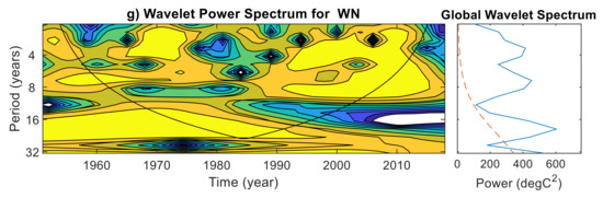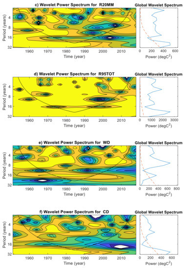 The variability of the climate indices is multifaceted, and often conveyed as multi-frequency and quasi-periodic in the time and frequency domain. Therefore, it is helpful to use wavelet methods for analyzing the variations in the frequency of climate indices at multiple scales averaged over 38 grid points in the Gomati river basin during 1951–2018. In doing so, the regularity of any climate index and its response to climate change can be better understood. Figure 6 shows the wavelet power spectrum for the climate indices, in which contours enclosing light yellow regions have larger power. The cone of influence is represented by a V shape with a black line to distinguish between non-significant periodic characteristics (edge effect artefacts) and significant periodic characteristics (within the cone of influence) at 95% confidence level [42]. Additionally, the global power spectrum and its statistical significance are depicted beside each climate index. The results show that the two-year period was dominant in the global wavelet spectrum of R50MM, with significant wavelet power found during 1975–1980 (Figure 6a). The wavelet power spectrum for D95P showed a significant power distributed across the 2–16-year bands, and the two-year period was dominant in the global power spectrum around 1970–1990 (Figure 6b). One exciting finding unraveled in Figure 6b is that the dominant two-year period of D95P has changed to the four-year after 1984 and remains there in the past two decades. The wavelet power spectrum of R20MM is following a similar pattern of D95P (Figure 6c). Figure 6c indicates that frequency of R20MM is 1 in two years until 1984, and later the frequency has changed to 1 in four years. Figure 6d shows the wavelet power in the 2–4-year band around 1955–1965, 1975–1983, 1990–2002, and 2007–2012 and in the 4–6-year band during 1955–1995, and in the 8–16-year band around 196–2000 of R99TOT. The 8-year period was found in the global wavelet of WD and a 2–4-year band in 1965–1975, 1995–2000 (Figure 6e). The global wavelet power spectrum of CD (Figure 6f) showed that the 4–6-year period was significant at the 95% confidence level during 1970–1980. WN was dominated by four- and eight-year periods, with a 4–8-year band, found in 1994–2014 (Figure 6g).