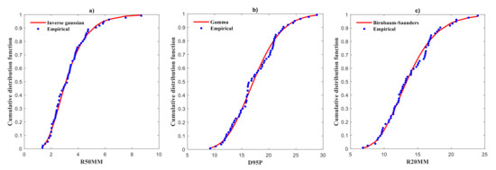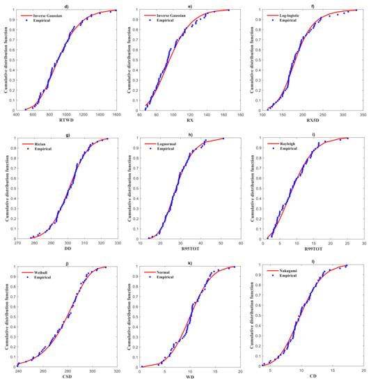- Fit a marginal distribution for the climate indices (for example, RTWD and R95TOT) and develop their cumulative distribution functions (CDF). We used 15 marginal distributions (1) Weibull distributions, (2) gamma, (3) extreme value, (4) exponential, (5) Birnbaum–Saunders, (6) generalized extreme value, (7) inverse Gaussian, (8) lognormal, (9) Nakagami, (10) logistic, (11) log-logistic, (12) t location-scale, (13) Rayleigh, (14) normal, and (15) Rician,