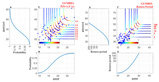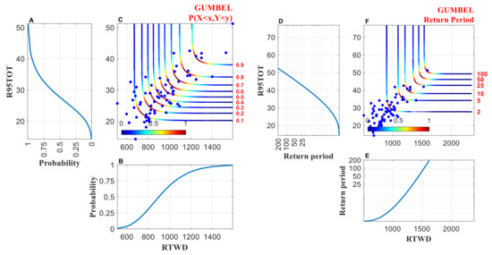 Cumulative distributive functions of (A) R95TOT and (B) RTWD, and their (D) and (E) are associated univariate periods (y-axis indicated in log scale). Joint probability iso lines derived from the Gumbell copula are displayed in Figure (C), and the associated return period isolines are illustrated in Figure (F). The colorbar [0 1] represents the joint density levels of joint probability and return periods, where 0 represents lower and one represents higher density level. Blue dots represent the observed pairs of R95TOT and RTWD. The figure is plotted using the MvCAT toolbox [51] in MATLAB (Version 9.4 R 2020b).