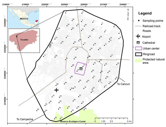 The city of Mérida Yucatán is located at coordinates 20°58′04″ N 89°37′18″ W, and is located on a structural karst plain with an average altitude of 9 m above sea level. The climate is warm subhumid (between 28–38 °C) with rains in summer Aw0 (i ‘) gw’ ‘is the driest subtype, with a thermal oscillation of 5 to 7 °C between the warmest month and the coldest month [24]. The dominant soils are from the Leptosol group with Nudilthic, Lithic, and Rendzic qualifiers [25].