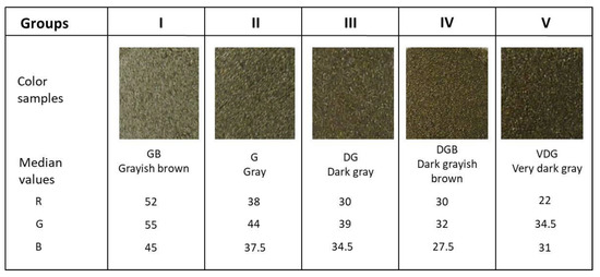 Five groups of road dust colors were identified: I, GB, greyish brown; II, G, gray; III, DG, dark gray; IV, DGB, dark grayish brown; and V, VDG, very dark gray (Figure 2). Group I that corresponds to the greyish brown road dust had higher RGB values than the darkest color groups.