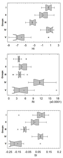 Figure 3 shows significant differences (p < 0.05) in HI, SI, and RI. HI and SI values show a downward trend in groups I < II < III < V, only group IV does not follow the sequence. The trend ranges from the lightest to the darkest. The RI allows differentiating group IV, and it is the most blown group.