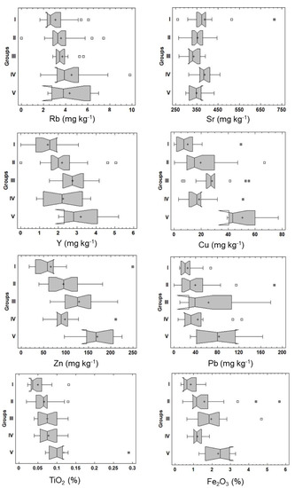 Potentially toxic element concentrations had significant differences with p values < 0.05), except for the Rb that had p values < 0.1 (Figure 4). There is a tendency to increase potentially toxic element concentrations (Y, Cu, Zn, Pb, TiO2, and Fe2O3), according to the darkest color groups, that is, a sequence of I < II < III < V (Figure 4). Only in the case of Sr, road dust of group IV (dark grayish brown) reached the highest concentrations. This group of road dust samples is different from the other groups, probably with very different minerals.