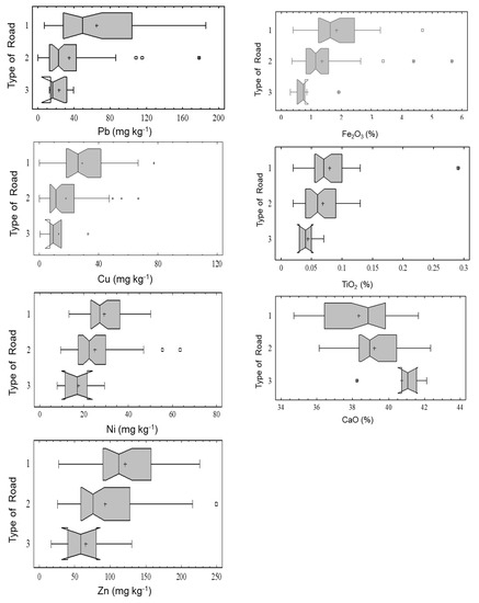 The primary roads had higher concentrations of Cu, Ni, Pb, and Zn in the road dust than the secondary and tertiary roads, as a consequence of the traffic of a greater number of cars (Figure 5). On the contrary, major elements such as CaO dominate on tertiary roads where fewer cars travel but where there is more dust of natural origin. Other elements as Na2, K2O, MgO, MnO, Al2O3, and SiO2 did not show differences between types of roads.