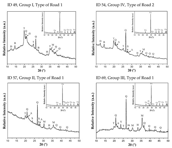 Calcite, quartz, ankerite, anorthoclase, and albite were the main minerals of road dust (Figure 6). These minerals are generally white, colorless, and gray. In smaller quantities, natural minerals were found such as hematite (red), goethite (brown), boehmite (white), dikite (white), sanidine (white), tosidite (white, light yellow, light green), and yeelimite (colorless).
