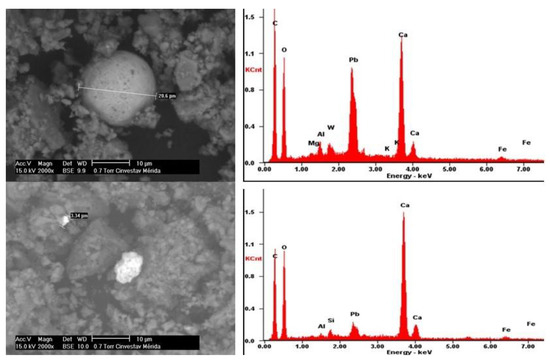 Observations of the dust in the scanning electron microscope allowed the identification of spherical and laminar particles, both of anthropogenic origin. The spherical ones from the combustion of gasoline (Figure 7), and the laminar ones from car brakes.