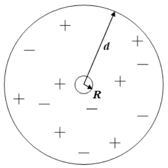 In order to determine the free energy of a positive ion, the spherical volume was used as in Figure 1, with an ion located in the center thereof. The time of settled life of an ion in the center of a sphere is comparable with the period of ion-acoustic oscillations. Hence, the ion’s correlation has to be considered, and the correlation of charged droplets should not be considered because there is not enough time for droplets’ correlation due to their massive size. Therefore, the carriers’ concentration will be recorded as follows [22]: