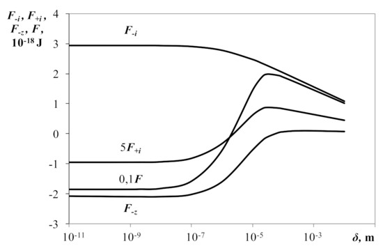 Free energies of charged droplet F−z, positive ion F+i, negative ion F−i and free energy of all charge carriers F subject to the distance between surfaces of the nearest droplets δ. T−i = 5000 K, T−z = T+i = 300 K, Z = 100, R−z = 10−6 m, R-i = R+i = 10−10 m, χ = 0.01.