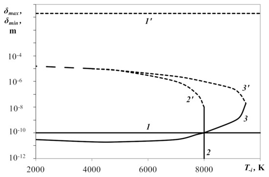 Figure 3 shows charts of distances δmax and δmin between surfaces of charged droplets at points of maximum and minimum free energies of a droplet (curves 1′, 1), ion (2′, 2) and simultaneously all charge carriers (3′, 3), subject to temperature T−i. The figure shows that the width of the droplet’s attraction area on the scale δ (between curves 1′ and 1) did not depend on temperature T−i. In addition, the attraction area of positive ions (between curves 2′ and 2) and of all charge carriers (between curves 3′ and 3) existed only at temperatures T−i below 104 K (when the charge value selected is Z = 500). Note that when the negative ion’s temperature is T−i < 4000 K, curves 2′ and 3′ sharply turned upward, tending to infinite values. This meant that at such temperatures, the Boltzmann distribution ceased to operate. Sharp aspirations of the curves upward are not shown in Figure 3. Instead, curves 2′ and 3′ were analytically extended to low temperatures based on behavior at high temperatures. It is obvious from the figure that the position of these curves weakly depended on the temperature in temperature range T−i < 5000 K.