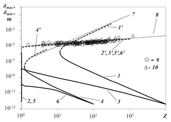 Figure 4 shows charts of distances δmax and δmin for free energies of a droplet (curves 1′, 1), a positive ion (2′, 2) and simultaneously all charge carriers (3′, 3), subject to the value of charge Z of the droplet when its radius is 10−6 m. Curves (4′, 4), (5′, 5), (6′, 6) are the same curves for droplet radius R−z = 10−8 m. According to the figure, the droplet’s attraction area exists when the charge is Z > 1. The width of the attraction area increases on scale δ with an increase of Z. The attraction areas of the positive ions, and simultaneously all charge carriers, exist with any value of charge Z, starting from one and greater. They also expand with an increase of Z.