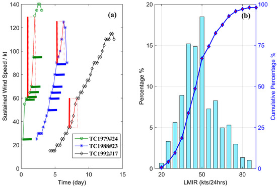 Three time series of the maximum sustained wind speed are shown in Figure 1a to demonstrate the physical meaning of LMIR (index numbers by the Joint Typhoon Warming Center, similarly hereinafter). TC1979#24 underwent a quick intensification and reached the 140 kt peak intensity in less than 3 days. TC1992#17 achieved category 4 within one week with no RI process. TC1988#23 underwent a mild RI and took about 4 days to reach peak intensity. Employing the intensity change of 30 kt per 24 h for RI, the RI number for TC1979#24 and TC1988#23 both were 6. With the RI number, the intensity changes of TCs apparently were not fully represented. As the red bars shown in Figure 1a, the LMIR value is 25 kt, 35 kt, and 70 kt, for TC1992#17, TC1988#23, and TC1979#24, respectively. The intensity change of the TCs is better illustrated by LMIR. Like the TC1979#24, TCs with a large LMIR value reach peak intensity in a very short time, leaving people in areas of impacts little time to respond to TC induced damage.