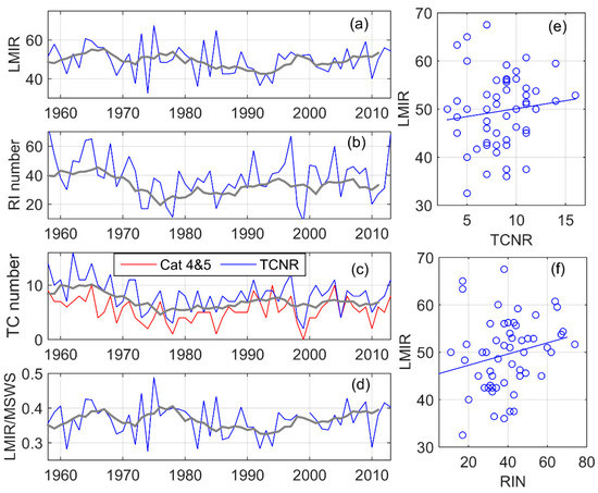 The historical time series of the annual mean tropical cyclone indices. (a) lifetime maximum intensification rate (LMIR, kt per 24-h); (b) number of rapid intensification events (RIN), (c) annual counts of tropical cyclones (TCs) (category 4 and 5 of the Saffir–Simpson scale) and counts of TCs with RI events (TCNR), (d) annual mean of the ratio between LMIR and TC maximum sustained wind speed with a gap in 1999, due to no Cat4&5 TC that year in the TC main development region (MDR) of western North Pacific (WNP). The gray polylines denote the 7-year running mean of the time series. Relationship between (e) TCNR, (f) annual RIN and the annual LMIR index with blue regression lines.