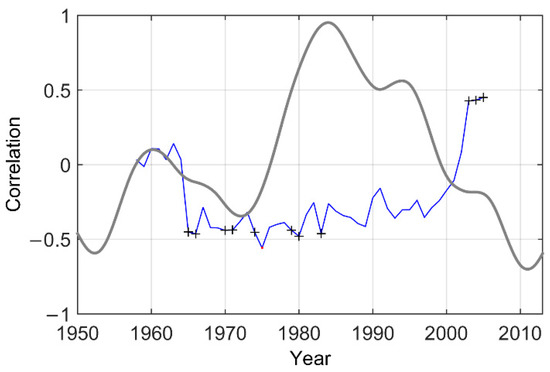 Correlation coefficient of the 10-year sliding correlation between the May–November averaged LMIR and the May–November averaged MEI index of 1958–2013 (blue line), with the correlation significant at the 90% labelled as black crosses and 95% confidence level labelled as red dot crosses. The gray curve is the Hanning smoothed (15-year) Pacific Decadal Oscillation (PDO) index (detrended).