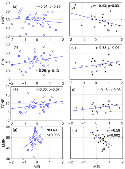 A significant negative correlation is found between the annual LMIR and the MEI (< 0.05) in the warm PDO phase. However, the correlation is not significant for the cold PDO phase (Figure 4a,b). The correlation between RIN and ENSO is similar, except it is a positive correlation and with a lower significance level (90%) for the warm PDO phase (Figure 4c,d). This result agrees with the RIN and ENSO relation [10]. For the TCNR, the difference is relatively small in the ENSO–TCNR relationship for the different PDO conditions compared to the differences for LMIR and RIN. Among all the three indices, LMIR has the largest difference in correlation coefficient and significance level for the warm PDO and for the cold PDO. This indicates that LMIR provides an additional dimension to study the PDO modulation on the ENSO and RI of the TC relationship. The inter-annual variability of LMIR is impacted by ENSO more closely during the warm PDO phase than in the cold PDO phase.