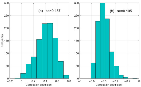 The variation of the correlation coefficient between the 7-year smoothed annual mean LMIR and MEI during the (a) cold-PDO and (b) warm-PDO phases across all the bootstrap samples, with correlation coefficient standard error (se) labeled. Data points for each PDO phase are resampled to create 1000 different data sets, and the correlation between the two variables is computed for each data set.