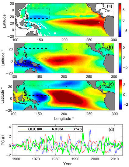 The leading Empirical Orthogonal Function (EOF) pattern of the May–November mean environment variables of 1958–2013 in the Tropical Pacific. (a) upper 100 m layer ocean heat content (OHC100), (b) relative humidity (RHUM), (c) vertical wind shear (VWS), (d) leading principal components (PCs). The dash boxes in (a–c) denote the tropical cyclone MDR in the western North Pacific.