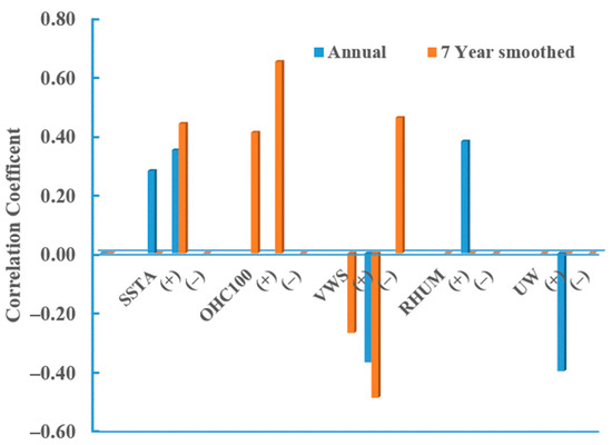 Correlation analyses were performed between LMIR and PC1 time series of the VWS, UW, RHUM, OHC100, and SSTA, in the MDR of the WNP on the annual and decadal timescales in order to explorer the impacts of the atmospheric and oceanic large-scale conditions that relate LMIR with ENSO during different PDO phases (Figure 8). For the interannual variation, the leading EOF of OHC100 positively correlated with LMIR in both PDO phases, but was not statistically significant. This indicates that the contribution of OHC100 to the change of the inter-annual ENSO–LMIR relation is associated with a change in the PDO status. For the leading SSTA EOF, its correlation with LMIR is significantly positive for the warm phase of the PDO (r = 0.35, p < 0.1). By comparison, during the cold PDO phase the result reveals no statistically significant relationship between LMIR and MEI (r = 0.17). Similarly, the correlations between the annual mean LMIR and leading EOFs of VWS, RHUM, UW are significant in the warm PDO phase with a correlation coefficient of 0.37, 0.38, 0.40 respectively, at the above 90% confidence level. The coefficient is much higher than the correlation in the cold PDO phase. Therefore, the atmospheric thermodynamic (SSTA, RHUM) and the dynamic conditions (UW, VWS) contributed to the ENSO–LMIR relationship change on the inter-annual time scales during different PDO phases, and the zonal wind (UW) is the major contributor.