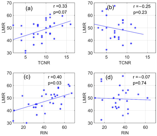 Relationship between LMIR and (a,b) TCNR, (c,d) RINs for the negative (right) and positive (left) phases of PDO, with blue regressions lines, coefficient of correlation (r) and p-value labeled.