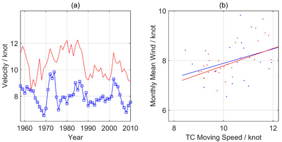 Time series of (a) and the scatter plot (b) of wind speed (monthly mean) over MDR and the translation speed of TCs. (b) for warm PDO phase, 1975–1999 with red regression line (r = 0.57, p < 0.01).