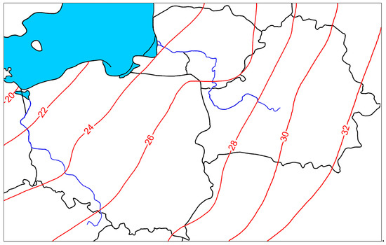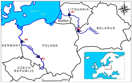 The Oder River catchment is located at a latitude of 49°24’–53°59’ and longitude of 13°26’–19°43’, in the territory of the Czech Republic, Germany, and Poland. The total length of the river is 854 km, and its catchment has an area of 118,610 km2. The largest tributaries of the Oder River in terms of length and catchment area are Warta, Bóbr, and Barycz. Mean annual discharge at the mouth of the Oder River is approximately 570 m3/s. The catchment of the Neman River is located at a latitude of 56°15′–52°45′ and longitude of 22°40′–28°10′, in the territory of Belarus, Lithuania, Russian Federation, Poland, and Latvia. The total length of the river is 914 km, and its catchment has an area of 98,200 km2. Both rivers are similar in terms of length, volume of discharge, as well as catchment size. The estuaries of Oder and Neman are located at a distance of only approximately 500 km. Nonetheless, the vicinity of Oder to the ocean through the North Sea, and Neman to extensive land masses to the east, determine their considerable influence on the rivers. This is evidenced by the indices of thermal continentalism, expressed as the degree of effect of land masses on the climate of a given area. The degree increases into the land, and decreases toward the surface of oceanic waters. Therefore, high values of mean annual temperature amplitude are recorded deep into the continent, and lower values are typical of coastal areas of Europe. The Oder catchment shows precipitation-nival regime, and the Neman catchment nival-precipitation regime [20]. Figure 2 presents the Oder and Neman Rivers on the background of the distribution of the thermal continentalism index according to Conrad. In the case of the Oder River and its catchment, the effect of oceanic climate is evident—the index is 20–26%. Neman and its catchment are in the zone of index 24–30%, i.e., the effect of continental climate is evident.