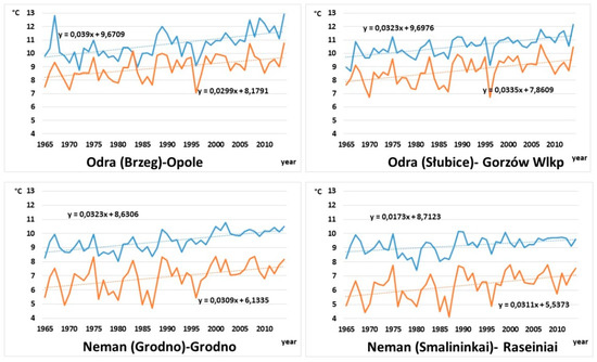 According to the above, mean annual water temperature in both rivers and the corresponding meteorological stations are mutually variable. The differences are particularly evident in the winter–spring period. Water temperatures in the Oder River are higher than those in the Neman River in autumn, winter, and early spring, whereas in March the differences exceed as much as 3 °C. In late spring and summer, water temperatures of both rivers are similar, and mean water temperature in Neman (Grodno) is the highest, reaching 20.8 °C. Such a situation should be associated with the location of the analyzed rivers, and greater effect of marine climate in the case of Oder, and continental in the case of the Neman River. All the analyzed pairs of stations show statistically significant correlations between the series of water and air temperature—from 0.74 for the pair Brzeg-Opole to 0.88 of the pair Słubice-Gorzów Wlkp.