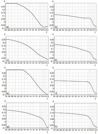 Monthly spectra of water and air temperature for the Oder and Neman Rivers—example for May: (a,b) Odra (Brzeg)-Opole, (c,d) Odra (Słubice)-Gorzów Wlkp, (e,f) Niemen (Grodno)-Grodno, (g,h) Niemen (Smalininkai)-Raseiniai.