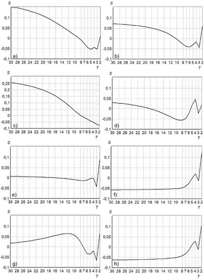 The statistical analysis of long-term water and air temperature fluctuations in the Oder and Neman Rivers was conducted in estimates of quasiperiodicity, autocorrelation, trend, and uniformity of statistical series. Parametric and non-parametric criteria were applied, such as the autocorrelation coefficient, Spearman rank correlation coefficient, t-Student test, and F Fisher test [22]. The methodology of temperature analysis for the purposes of forecasting was based on the analysis of similarity of spectral images of water and air temperature [23]. The spectral density of the studied rivers was analyzed in time periods according to the following formula [24]: