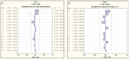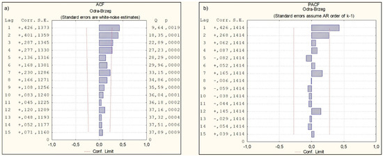ACF (a) and PACF (b) for mean annual water temperature for station Oder-Brzeg with the excluded trend (Cols: Lag, Correlation, Standard Error, Q and P—parameters).