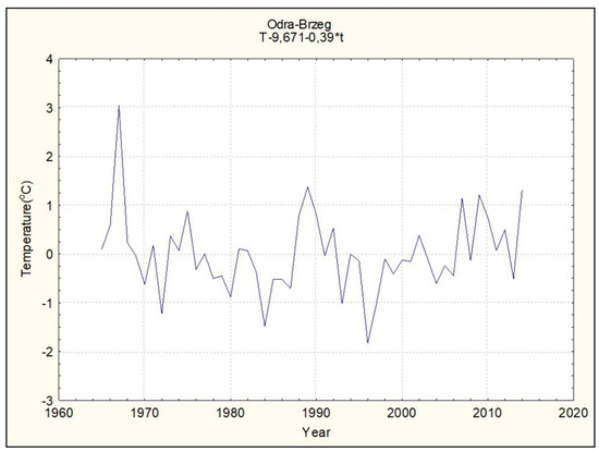 Average annual water temperature with the excluded trend (for Oder-Brzeg trend is T = 0.39 × t + 9.671).