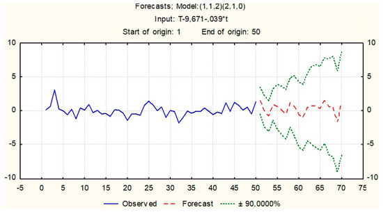 The order of autoregressive and moving averages was determined in accordance with guidelines included in Table 1. Parameters Ds and Qs were calculated for series obtained after adopting one difference with lag 1, and then seasonal difference with lag 1–4 (obtained from the analysis of the diagram of spectrum density). As a result, the following values of parameters were obtained: d = 1, p = 1, q = 2, Ds = 1, Qs = 0, Ps = 2. The model was therefore represented as ARIMA (1,1,2) (2,1,0). The result of the forecast of the transformed series for the selected model is presented in Figure 9.