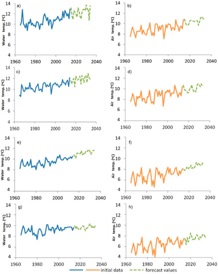 Predicted temperatures of water and air temperature for the Oder and Neman Rivers: (a) Odra (Brzeg), (b) Opole, (c) Odra (Słubice), (d) Gorzów Wlkp, (e) Niemen (Grodno), (f) Grodno, (g) Niemen (Smalininkai), (h) Raseiniai (±90% confidence interval).