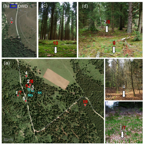 Overview of the locations of the individual measuring spots of the DWD station (blue), micrometeorological stations (MS, SS), the Micro-Loggers of System-1 (white, ML-1 to ML-6) and System-2 (red, ML-7 to ML-10). The graphs give an aerial view (source: Google maps) from the forest (a), the adjoining open land to the north (b) as well as images of four diverse forest measurement spots (c–f).