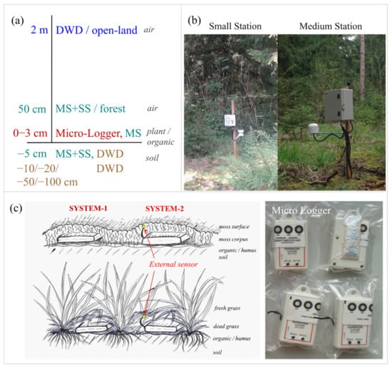 Features of the Micro-Loggers and climate stations in the forest (MS, SS) and the weather station of the German Weather Service (= Deutscher Wetterdienst, denoted as “DWD) (a,b); (c) illustrates the general measurement setup of the two Micro-Logger Systems 1 (internal sensor) and 2 (external sensor), which were located under moss (top) or grass (bottom).