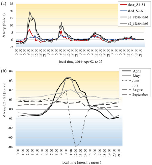 The daily temperature difference curves are represented as monthly averages from April to September, to depict differences between the months (Figure 3b). While in April and May there was still a clear and changing system difference in the course of the day, in August and September there was hardly any difference between the two systems. With respect to the weather situation, the difference can be attributed to the monthly weather situation and partly confirms the findings of the first part: higher deviations of the two systems occurred (a) on days compared to nights, (b) in months with many clear and sunny days compared to rather cool, rainy months (compare Section 3.1).