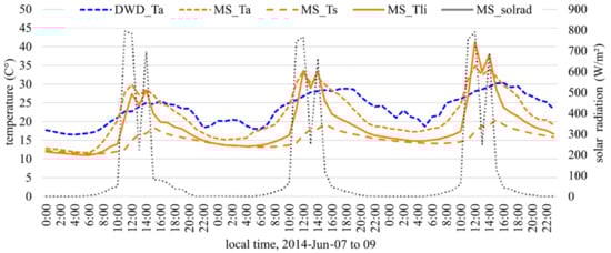 Diurnal radiation and temperature pattern during clear sky conditions over three days in June 2014. MS refers to the Medium Station at the “small clearing”, with Ta = air temperature (50 cm), Ts = soil temperature (−5 cm), Tli = near-surface temperature, solrad = solar radiation, and DWD_Ta air temperature (2 m) of the nearby official weather station.