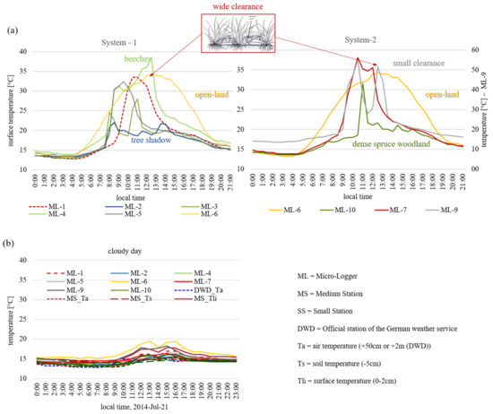 The comparison of the internal (S1, Figure 5a) and external (S2, Figure 5b) sensor system at “wide clearing” (ML-1,7, red lines) is in line with the results from Section 3.2: ML-7 recorded warmer temperatures than the internal sensor system ML-1, and detected the short phase of shading (due to vegetation) around 11 a.m., while ML-1 did not respond to the changes.