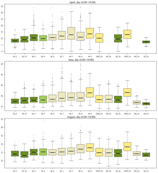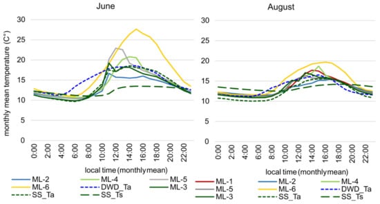 The effects and observations described above also appeared in the daily course of the monthly mean (Figure 6). As averages of clear and cloudy days, however, values and deviations were smaller compared to a single clear day (compare Figure 5a). It is noticeable that intradifferences between the MLs and interdifferences to air and soil temperatures were more pronounced in June (early summer) than in August (mid-summer). According to results in Section 3.1., the two months differed considerably from long-term averages—while June was significantly warmer and sunny, the weather in August was exceptionally cool and wet.