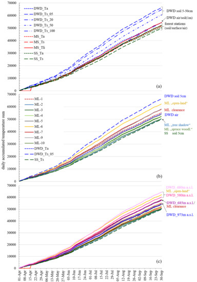 Looking at the accumulated temperature, the nearby DWD station was comparable to the thermal situation at the clearances (“wide” and “small”) in the forest, i.e., moderate to warm aspects of the within-site range. The warmest Micro-Loggers inside the forest (external sensor system) were comparable with a DWD station located 300 m lower. The near-surface conditions at the open-land (the standard situation of a DWD station) were comparable to DWD stations located about 450 m lower. Due to a lack of comparable DWD stations for the coolest sites, no comparisons to higher elevated DWD stations were possible. Nevertheless, these results suggest that the within-site thermal variation could be even larger than previously described [17]. Based on three surface loggers, Graae et al. (2012) described a thermal within-site variation comparable to a 300 m change in altitude—a temperature difference that was determined in this study by considering only the warmest location compared to local DWD station without considering the coldest sites.