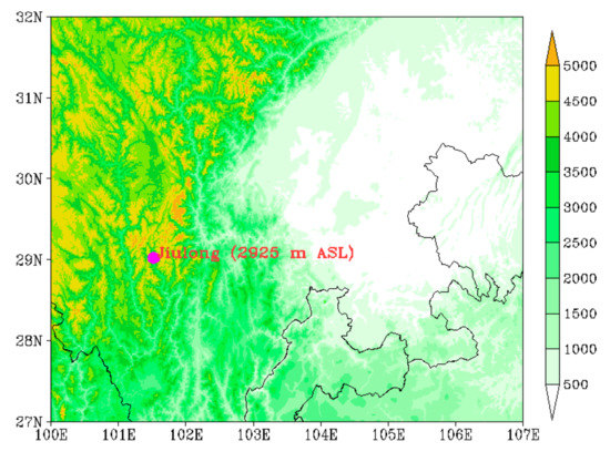 Jiulong County is located in the eastern TP slope and in the transition zone between the main body of the TP and Chengdu Plain. It has undulating terrain, high in the north and low in the south, with a large elevation difference. Mountains and valleys are the two main geomorphic features in the territory of Jiulong. This unique geographical location makes Jiulong a main source of the southwest vortex and an eastward movement route of the TP low value system [17,18]. The Jiulong observation station (101.52° E, 29.02° N, 2925 m above sea level) is located on the low mountain side of the northwest–southeast river valley. The two sides with range less than 5 km away from the observation station are high mountains with altitudes of about 4500 m (Figure 1).