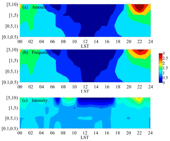 Diurnal variation of precipitation is a result reflecting the comprehensive influence of atmospheric thermal and dynamic processes on the water cycle [16]. Studying the diurnal variation of precipitation over the TP is helpful not only to understand the characteristics of precipitation on subdiurnal scale, but also to explore the corresponding atmospheric thermal and dynamic processes, and to further understand the formation and evolution mechanisms of precipitation over the TP. Figure 2 shows the diurnal variations of precipitation amount, frequency and intensity in different grades obtained from summer (June to August) of hourly precipitation in Jiulong during 2013–2020. Precipitation amount, frequency and intensity present obvious diurnal variations, especially in the two grades of [1, 5) mm and [5, 10) mm. Both precipitation amount and frequency present a similar unimodal pattern in diurnal variation, in which the value is low during the day and high at night with a maximum of 22 LST. For precipitation intensity, although it is generally low during the day and high at night, a bimodal pattern was found for hourly precipitation greater than 1 mm, with the main peak at 22 LST and the second peak at 09 LST. These results indicate that summer precipitation in Jiulong mainly occurs at night, and precipitation amount and frequency are greater at night than during the day. This phenomenon in Jiulong may be related to the effect of valley wind caused by local terrain forcing, because the ascending branch of night valley wind circulation is conducive to the occurrence and enhancement of local precipitation [22].