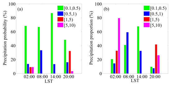 The soundings in Jiulong are only launched at 02, 08, 14 and 20 LST each day during the observational experiment (21 June to 31 July). Therefore, in order to investigate atmospheric thermal and dynamic vertical structures under precipitation conditions by using sounding profiles, the precipitation probability and proportion in different grades obtained from hourly precipitation at launch times in Jiulong during 2013–2020 were analyzed. As shown in Figure 3, hourly precipitation less than 1 mm can occur at all launch times and those greater than 1 mm only occur at 02 and 20 LST. For hourly precipitation less than 1 mm, the precipitation probability is generally higher during the day and the precipitation proportion is more obvious. The maximum precipitation probabilities for hourly precipitation of [0.1, 0.5) mm, [0.5, 1) mm, [1, 5) mm and [5, 10) mm occur at 14, 08, 20 and 02 LST, respectively, with corresponding values of 88%, 33%, 32% and 9%. Moreover, the maximum precipitation proportions also occur at the same launch time for the maximum precipitation probability, with values of 68%, 59%, 42% and 80% for hourly precipitation of [0.1, 0.5) mm, [0.5, 1) mm, [1, 5) mm and [5, 10) mm, respectively. Note that although the precipitation probability of hourly precipitation within 1 mm is higher than that of hourly precipitation above 1 mm, the precipitation proportion of the latter is far higher than that of the former. During the observational experiment period in Jiulong, hourly precipitation of less than 1 mm can occur during the day, while hourly precipitation greater than 1 mm mostly occurs at night and is the main contributor to the nighttime precipitation amount.